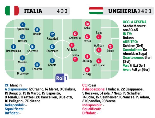 Dopo il pari a Bologna contro la Germania, l’Italia tornerà in campo contro l’Ungheria, per la sfida a Cesena, seconda gara di Nations League. Ci sarà il rientro di Di Lorenzo a destra e soprattutto Spinazzola a sinistra. In attacco spazio a Gnonto per le conferme dopo le buone sensazioni della sfida contro i tedeschi. Per quanto riguarda gli ospiti Marco Rossi, punterà sulla fase difensiva, vista contro l’Inghilterra e sull’estro di Szoboszlai sulla trequarti.