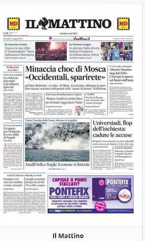 NewsCalcio Rassegna stampa dell’ 8 giugno. “PRIME PAGINE SPORTIVE” By Giuseppe Sacco il Giu 8, 2022 - 07:30:06 0 Condividi In primo piano sui principali quotidiani sportivi nazionali Factory della Comunicazione CalcioNapoliRassegnaStampa 0 Condividi FacebookTwitterGoogle+ReddItWhatsAppPinterestE-mail