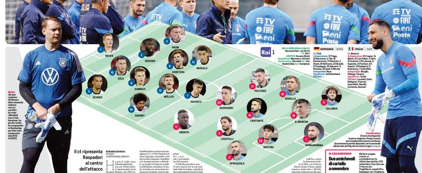 Questa sera a Mönchengladbach si giocherà per la quarta giornata la sfida tra la Germania e l’Italia. All’andata il match è finito in parità con le reti di Pellegrini e pareggio di Kimmick. Per i tedeschi, c’è l’occasione per migliorare una classifica che al momento dice solo tre punti, mentre gli azzurri primi a 5 punti. Il c.t. Flick rispetto al match di Bologna punterà su Havertz in attacco, mentre in difesa il neo del Real Madrid Rudiger con Sule. Per Mancini invece l’attacco sarà composto da Politano, Raspadori e Gnonto