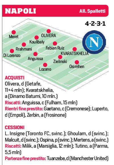 In attesa di risolvere le questioni dei rinnovi, oppure di possibili offerte per i big della rosa, il tecnico di Certaldo Luciano Spalletti ha al momento due acquisti certi: Olivera e Kvaratskeila e i riscatti di Juan Jesus e Anguissa. Ecco il grafico della formazione sul CdS. Certi gli addii Ospina, Ghoulam, Malcuit, Insigne e Mertens