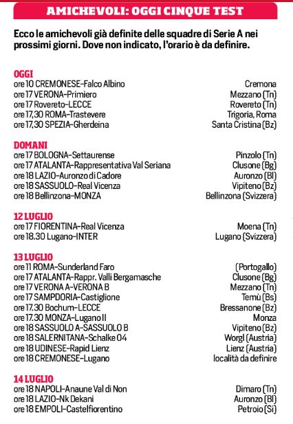 NewsCalcioRassegna Stampa Serie A – Le amichevoli estive. Oggi se ne giocano 5. Previste 2 per i l Napoli By Giuseppe Sacco il Lug 9, 2022 - 17:00:37 0 Condividi La prima del Napoli è prevista per i l14 contro la rappresentativa locale Factory della Comunicazione 2Dinmarogare 0 Condividi FacebookTwitterGoogle+ReddItWhatsAppPinterestE-mail