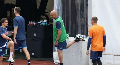 Sessione di stretching per Spalletti, che poi è subito corso in campo per seguire da vicinissimo il lavoro dei suoi. Fonte Mattino.it