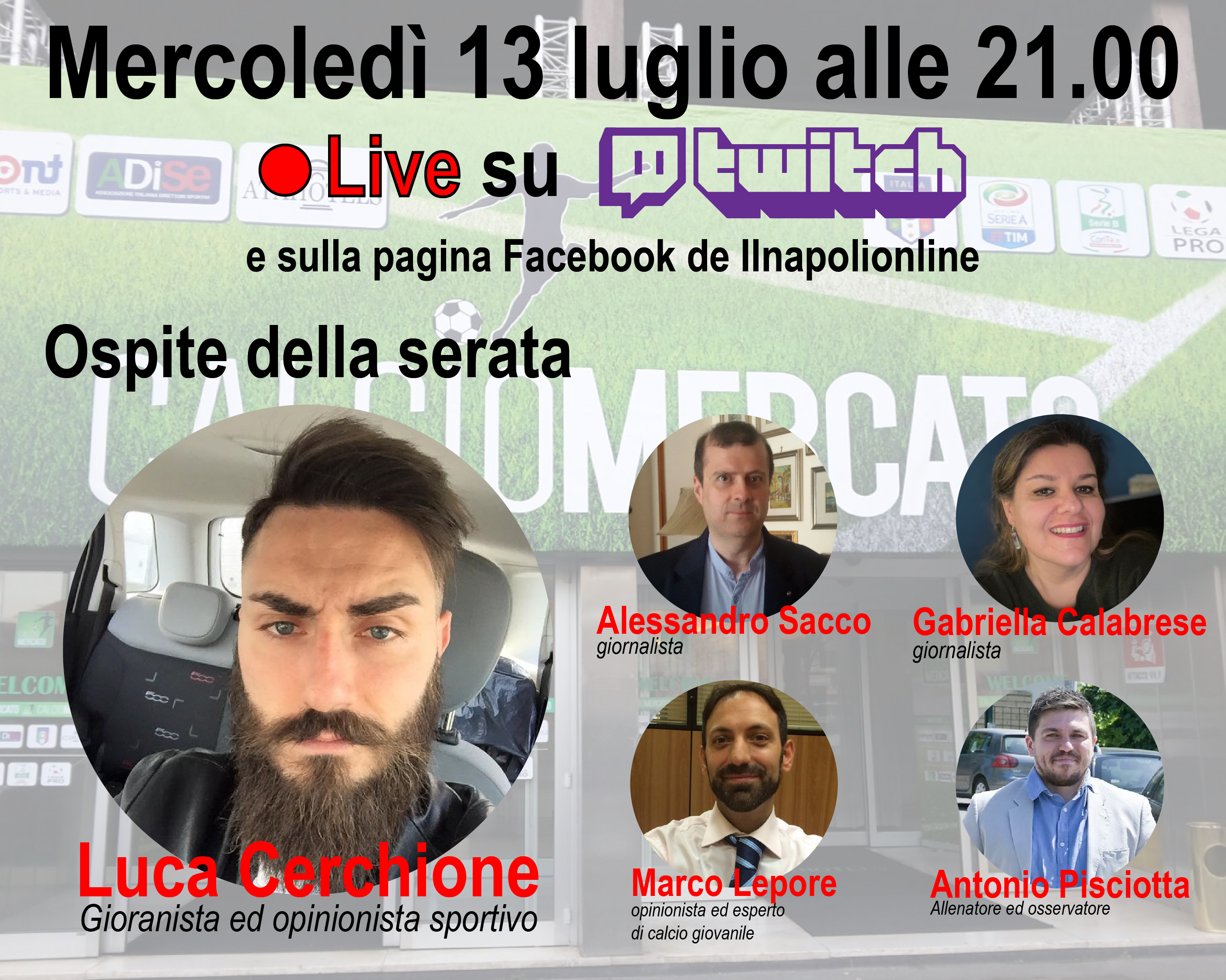 Conduce Gabriella Calabrese, giornalista; alla live parteciperanno Marco Lepore, opinionista ed esperto di calcio giovanile; Alessandro Sacco, direttore della testata giornalista ilnapolionline.com, Antonio Pisciotta, Allenatore ed Osservatore e redattore del napolionline;