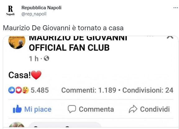 NewsSlide Il grande scrittore e tifosissimo azzurro M. De Giovanni è a casa! By Giuseppe Sacco il Lug 19, 2022 - 09:31:43 0 Condividi Factory della Comunicazione Fonte: Repubblica CasaDe Giovanni 0 Condividi FacebookTwitterGoogle+ReddItWhatsAppPinterestE-mail