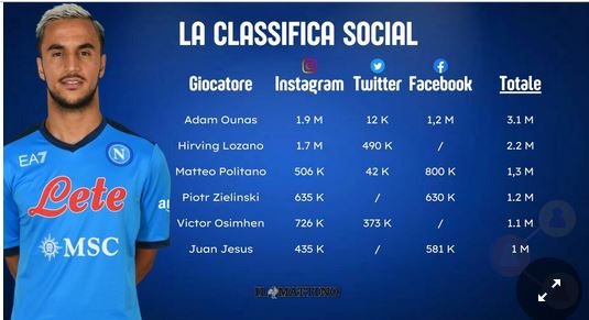 Adam Ounas, uno che – considerando i tre social principali Instagram, Facebook e Twitter – mette insieme oltre 3 milioni di followers tra l’Algeria e il mondo. Anche lui, però, ha la valigia pronta. Il mito dei messicani Lozano viene subito dietro di lui (2.2 mln), poi anche Politano (1.3), Zielinski (1.2) e Osimhen (1.1). Nel club del milione azzurro ci entra anche Juan Jesus. Solo tre calciatori del Napoli utilizzano tutte le tre piattaforme social principali: Ounas, appunto, ma anche Politano e l’ultimo arrivato Mathias Olivera, che mette insieme complessivamente solo 113mila followers. Gli azzurri sono pronti a sbarcare in Asia con Kim Min-Jae, ma il sudcoreano deve migliorare i suoi numeri: utilizza solo Instagram con poco più di 500mila sostenitori. Fonte: mattino.it