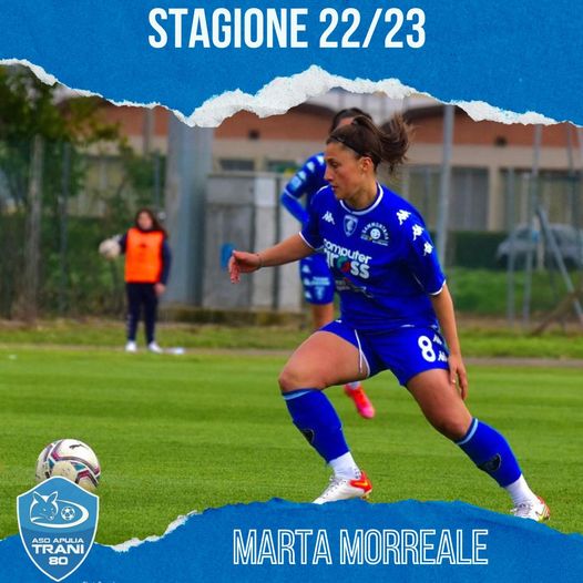 A soli sedici anni, esordisce in Serie A con la maglia della Fiorentina Women’s, squadra con la quale vince per due volte il trofeo “Beppe Viola” di Arco di Trento, con la Primavera, e due Coppe Italia e una Supercoppa Italiana, con la Prima Squadra. Disputa un Europeo Under 17 con la nazionale italiana, prima e dopo aver raccolto gettoni con Under 19 e Under 16. Nelle ultime due stagioni all’Empoli Ladies, la centrocampista Marta Morreale, classe 2001, è ufficialmente una nuova giocatrice dell’Apulia Trani.