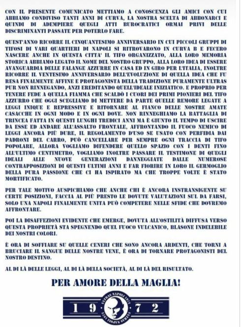«Quest’anno ricorre il cinquantesimo anniversario in cui piccoli gruppi di tifosi fecero nascere il tifo organizzato in questa città. Oggi scegliamo di mettere da parte quelle remore legate a leggi inique e repressive e ritornare al fianco delle nostre amate casacche in ogni modo e in ogni dove. Vogliamo difendere quello spazio con i denti fino all’ultimo centimetro. Vogliamo inoltre passare il testimone di quegli ideali alle nuove generazioni danneggiate dalle numerosi contrapposizione di questi ultimi anni e far fiorire in loro il germoglio della pura passione».