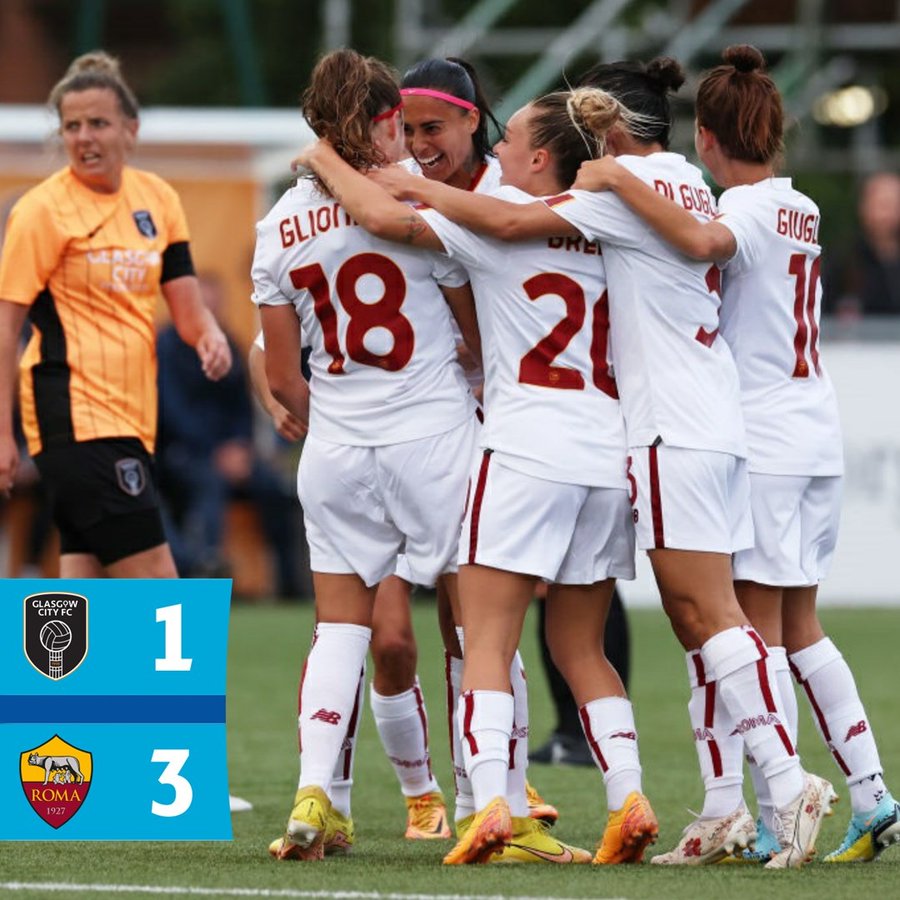 Questa sera c’era grande attesa per l’esordio nella Women Champions dell’A.s. Roma. Le giallorosse espugnano il campo di Glasgow per 1-3. Decisiva la doppietta di Benedetta Glionna e la rete di Paloma Lazaro. La Juventus Women vince facile per 4-0 contro il Racing Luxemburg. In gol Rosucci, Girelli, Caruso e Bonfantini.