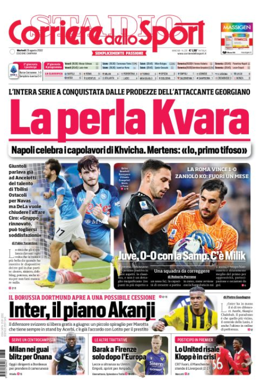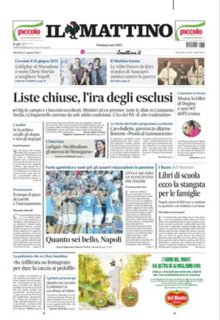 NewsCalcio Rassegna stampa del 23 agosto. “PRIME PAGINE SPORTIVE” By Alessandro Sacco il Ago 23, 2022 - 08:30:16 0 Condividi In primo piano sui principali quotidiani sportivi nazionali Factory della Comunicazione CalcioNapoliRassegnaStampa 0 Condividi FacebookTwitterGoogle+ReddItWhatsAppPinterestE-mail