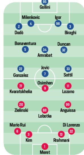 Domani sera allo stadio “Franchi”, fischio d’inizio alle ore 20,45 il Napoli andrà a far visita alla Fiorentina per la terza di campionato. I viola sono reduci dal passaggio alla fase a gironi di Conference League. Il tecnico Vincenzo Italiano manda in campo Jovic per l’attacco e come terzino destro Dodò per marcare Kvaratskeila. Per mister Spalletti invece manderà in campo gli stessi 11 base che hanno battuto Verona e Monza. Panchina per i nuovi acquisti, mentre out per infortunio Demme e Fabian Ruiz.
