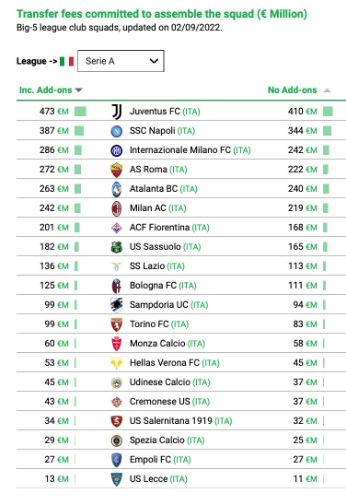 Il Milan campione d’Italia è solo al quinto posto con 242 milioni investiti per la rosa che in larga parte ha vinto lo scudetto qualche mese fa. Fonte: mattino.it