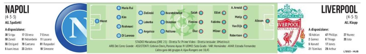 I terzini che spingono, gli esterni di attacco che convergono e fanno gol, il Liverpool sulle fasce è messo benissimo: Alexander Arnold e Robertson sono i due laterali bassi che diventano vere e proprie ali, Salah sulla destra e Luis Diaz sulla sinistra sono due pericoli costanti per le difesa avversaria. I duelli fondamentali del match al Maradona saranno proprio quelli sulle fasce dove anche il Napoli è messo molto bene: Di Lorenzo che controllerà Luis Diaz è infatti molto temibile anche nella fase di spinta, stesso discorso sull’altro lato per Mario Rui che avrà il compito complicato di marcare Salah e sarà aiutato nei raddoppi da Kim e Zielinski ma nello stesso tempo è molto efficace quando sale palla al piede per costruire la manovra e proporsi per il cross. E il Napoli in attacco sarà molto temibile soprattutto sulla sinistra con Kvaratskhelia che nell’uno contro uno può mettere in difficoltà Alexander Arnold. Duelli chiavi anche a centrocampo perché il palleggio rappresenta uno dei punti di forza sia del Liverpool che del Napoli: decisivo sarà il duello a distanza tra i due playmaker Lobotka e Fabinho e quello sul centro-destra tra Anguissa e Milner. Fonte e grafico Il Mattino