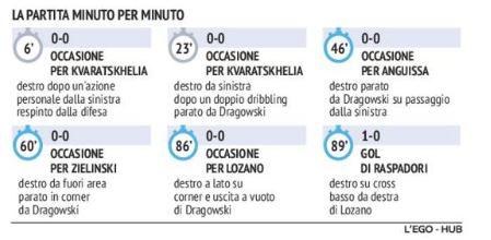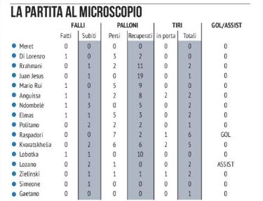 successi. E anche stavolta la formazione ligure con lo stesso tipo di partita, difesa a oltranza e poche ma pericolose ripartenze, ha retto a lungo e sfiorato anche il vantaggio, evitato da un salvataggio sulla linea di Rrahmani. Gli azzurri hanno avuto il gran merito di crederci sempre, di non abbassare mai la guardia e di continuare ad attaccare alla ricerca del gol vittoria: fondamentale è stato l’ingresso di Lobokta in avvio di ripresa al posto di Ndombele, lo slovacco ha assicurato ritmo, geometrie e verticalizzazioni. Importante anche gli inserimenti di Zielinski, per la sua qualità negli ultimi venti metri, di Lozano per la vivacità sulla fascia e di Simeone per la sua presenza in area di rigore sempre scomoda per i difensori avversari. Così il Napoli ha trovato nuove energie