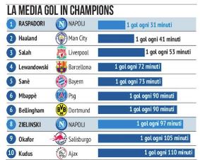 Alla sua prima Champions League in carriera Raspadori sta facendo subito la differenza: ha segnato un gol in meno di Haaland, Salah, Lewandowski, i tre primatisti con 5 gol dopo le prime 4 giornate di Champions, tre superbomber che in carriera hanno segnato tantissimo, punti di forza di Manchester City, Liverpool e Barcellona.