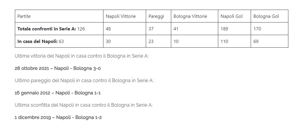 Così Napoli e Bologna nei 126 confronti in A