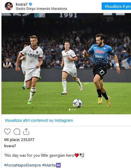 «Questo giorno è per te, piccola eroina georgiana», queste le parole usate da Khvicha Kvaratskhelia sui social dopo la vittoria contro il Bologna. L’asso del Napoli è andato in campo con un polsino speciale e un nome da ricordare: quello di Marita Meparishvili, una ragazzina georgiana di 13 anni (futura tennista) morta per folgorazione in una fontana nel centro di Tbilisi il 13 ottobre scorso che Kvara ha ricordato poi anche sui social al fischio finale.