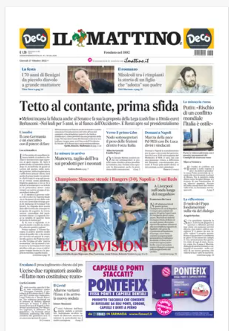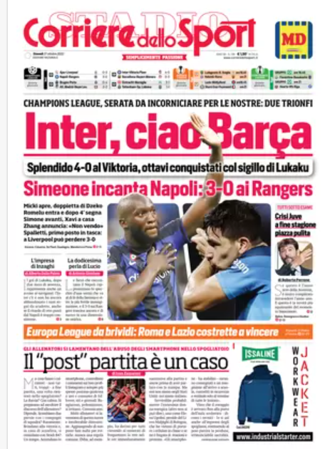 NewsCalcioRassegna Stampa Rassegna stampa del 27 ottobre – “PRIME PAGINE SPORTIVE” By Alessandro Sacco il Ott 27, 2022 - 07:39:01 0 Condividi In primo piano sui principali quotidiani sportivi nazionali Factory della Comunicazione CalcioNapoliRassegnaStampa 0 Condividi FacebookTwitterGoogle+ReddItWhatsAppPinterestE-mail