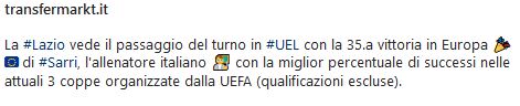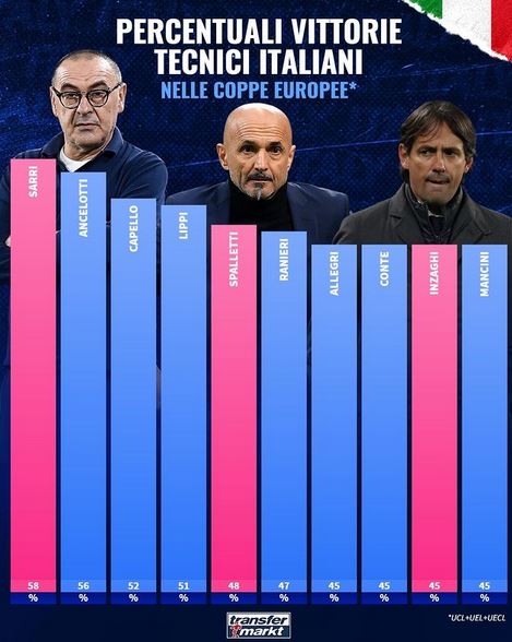 Luciano Spalletti ha vinto il 48% delle sue partite nelle coppe europee. Questo il dato che viene fuori dall’ultimo turno di coppa e pubblicato in queste ore da Transfermarkt, la piattaforma di analisi calcistica che accende i riflettori sull’allenatore del Napoli. Che nella classifica degli allenatori italiani insegue solo mostri sacri della panchina: gli ex Napoli Ancelotti (56%), e Lippi (51%), anche Capello (52%). Ma al primo posto della speciale classifica c’è un altro ex azzurro come Maurizio Sarri (58%)