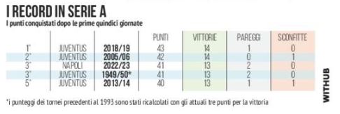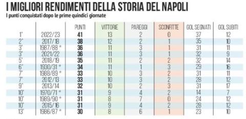 consecutive in serie A: con la Roma nel 2005-06. Nella storia del club partenopeo solo Maurizio Sarri con 13 successi di fila, a cavallo delle stagione 16/17 e 17/18 ha fatto meglio del tecnico di Certaldo. Ma questo è un altro primato: perché qui c’è il record, ma c’è pure l’odore dello scudetto. Dietro questa squadra che fa sognare, che segna tanto (37 gol) e subisce poco (12 gol) c’è la maschera di Spalletti, il ghigno del suo calcio liquido, il linguaggio attoriale di un corpo sapiente che ora domina a Napoli come pochi altri sono riusciti a fare così in fretta. Negli anni della sua tirannia la Juventus ha marciato a questi ritmi solo nella stagione 18/19 (allenatore Sarri), quando di punti ne aveva 43. L’unica squadra italiana ad aver fatto meglio di questo Napoli di Spalletti. E c’è tanta Juventus tra le migliori 5 partenze a razzo. Dunque, questo Napoli va a spasso con la storia del calcio italiano. Ne riscrive i record. Spalletti ne è abituato, per questo i numeri non gli fanno né caldo né freddo: anche alla Roma è andato via da migliore: perché ha conquistato una media punti – nella sua lunga permanenza in giallorosso – superiore a quella di Capello e di Liedholm. E pure di Rudi Garcia. Fonte: Il Mattino