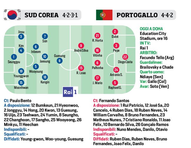 Nell’allenamento aperto alla stampa nei classici 15 minuti, il difensore della Corea del Sud Kim Minjae, in forza al Napoli, non ha svolto la seduta pomeridiana, perciò è in dubbio. Il c.t. Paulo Bento, oggi non sarà in panchina per squalifica, valuterà se rischiarlo dal primo minuto, oppure farlo riposare. I lusitani faranno riposare dal primo minuto Cr7, con in campo dal primo minuto Andrè Silva e Leao. Un’altra novità invece sarà Joao Mario come esterno di centrocampo.