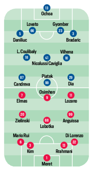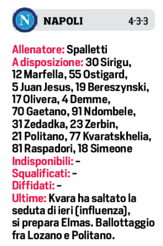 La difesa sarà infine composta da: Di Lorenzo, Kim, Rrahmani e Mario Rui