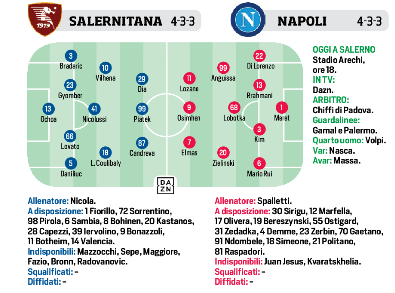 (Formazione) Salernitana-Napoli, cambio di modulo per Nicola. Spalletti ritrova la difesa tipo