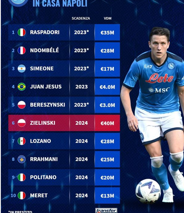 Dieci calciatori azzurri in scadenza alla fine di questa stagione. Il Napoli vola in campo con Luciano Spalletti ma al termine della lunga annata azzurra avrà più di una questione da risolvere: dando per scontate le definizioni di affari per Raspadori e Simeone – che erano arrivati in prestito la scorsa estate – gli azzurri dovranno anche pensare a contratti come quello di Juan Jesus, di nuovo in scadenza, o Ndombelé in prestito dal Tottenham. Sul tavolo ci sarà anche quello di Bereszynski, arrivato dalla Sampdoria qualche settimana fa e in attesa di capire se potrà essere riconfermato. fonte: mattino.iy