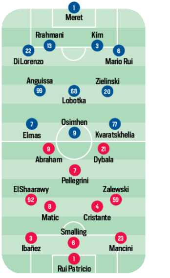 (Formazione) Napoli/Roma, Elmas al posto di Politano. Difesa a tre per Mourinho