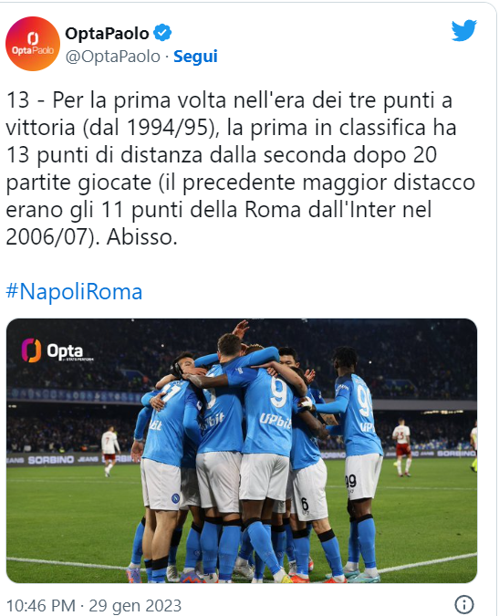 La capolista se ne va, cantano i tifosi del Napoli, ed hanno ragione, visto che la sua è una vera e propria, fuga, storica tra l’altro. Ultimamente, scrivi Napoli di Spalletti e leggi record. Gli azzurri, dopo la vittoria sulla Roma al Maradona, allungano in testa alla classifica. Come riportato da Opta Italia, per la prima volta nell’era dei tre punti a vittoria (dal 1994/95), la prima in classifica ha accumulato 13 punti di distanza dalla seconda dopo le prime venti partite giocate.