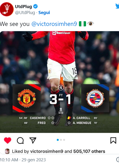 Anche Victor Osimhen “festeggia” la vittoria del Manchester United in FA Cup: i Red Devils battono 3-1 il Reading FC e scappa il like dell’attaccante del Napoli al post Instagram dedicato al match inglese dal portale 4-3-3. Un like che non è passato inosservato anche ai tifosi dello United: un segnale di mercato per la prossima estate? L’interesse degli inglesi c’è, il “like” dell’azzurro anche… Fonte e foto mattino.it