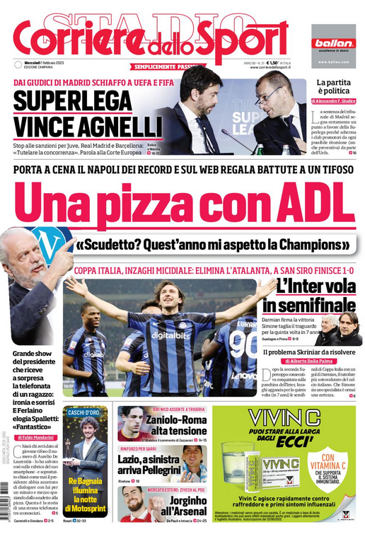 NewsCalcioIn Evidenza Cds Campania – UNA PIZZA CON ADL”: “Quest’anno mi aspetto la Champions!” By Giuseppe Sacco il Feb 1, 2023 - 07:40:42 0 Condividi In prima pagina e nel profilo interno del Cds edizione Campania Factory della Comunicazione ADLCalcioChampionsNapoli 0 Condividi FacebookTwitterGoogle+ReddItWhatsAppPinterestE-mail