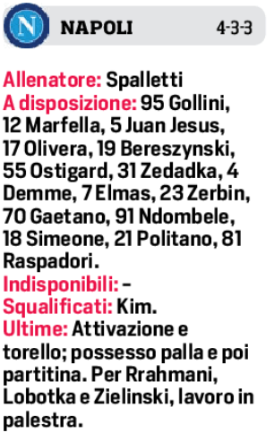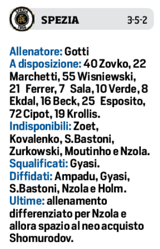 Domenica allo stadio “Picco”, fischio d’inizio ore 12,30 si giocherà per il classico testa-coda Spezia-Napoli. Per i liguri allenati da Luca Gotti diverse le assenze, su tutti: Zoet, Zurkowski, Bastoni e Nzola per infortunio e Giasy squalificato. Il modulo sarà 3-5-2, dove in attacco giocherà il neo acquisto Skomurodov al fianco di Daniel Maldini. Per Spalletti invece probabilmente lo stesso 11 visto contro la Roma. Allenamento a parte, a scopo precauzionale, per Rrhamani, Lobotka e Zielinski. Come esterno destro Lozano in vantaggio su Politano.