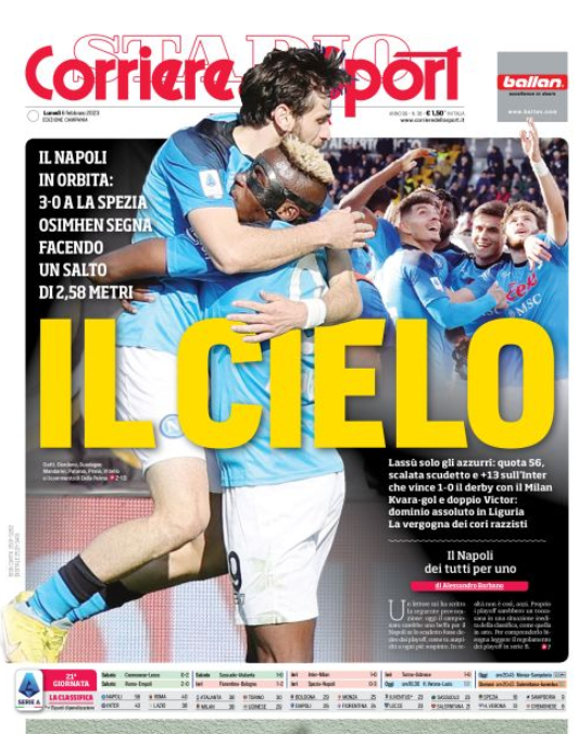 Dov’è arrivato (2,58 cm), con quello stacco regale che alla fine ha spinto Di Lorenzo a divertirsi sui social («Kvara, dì a Osi di scendere, dobbiamo esultare»), è scritto ormai nei libri di storia del calcio, nei quali VO9 ha scelto di accedere per affiancare i giganti di questo calcio che si sta prendendo a modo suo e che ormai lo sistema semplicemente alle spalle di Halland, che ne ha fatti venticinque, nove in più. Ma questi sono persino stucchevoli dettagli statistici, perché ormai ha scelto – e da un bel po’ – cosa fare da Grande nella sua vita da bomber: i gol si contano, volendo si pesano, adesso si misurano anche in altezza, perché il codice di Osimhen non ha infrastrutture, non ha più neanche limiti.  «Adesso è importante prepararsi per la prossima gara e dobbiamo rimanere concentrati sulla Serie A perché questo è un campionato molto difficile». E però sembra prenotato, anche se certe cose conviene pensarle ma non dirle, neanche a bassa voce: «Alla fine vedremo. Abbiamo una bella possibilità di vincerlo ma dobbiamo ragionare di partita in partita, senza spingersi troppo in là con i pensieri». Ma con la testa sì, andandosene a due metri e cinquantotto centimetri sotto al cielo. L’uomo dei sogni vola alto.