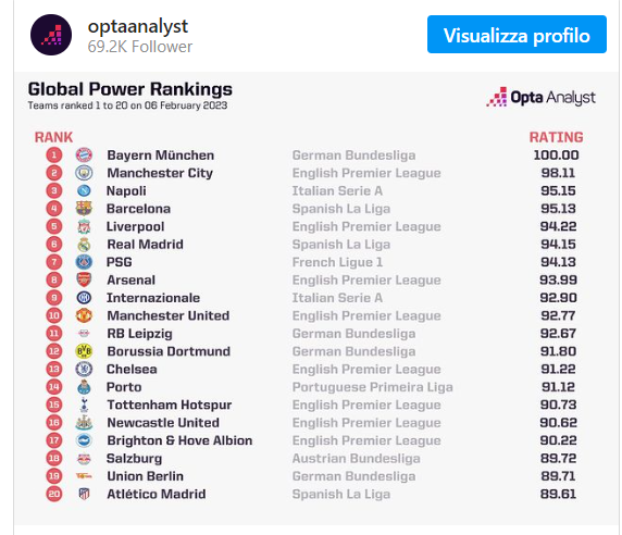 Come ogni anno, anche la classifica Global Power Rankings di Opta viene aggiornata in base al valore e alle prestazioni delle varie squadre europee.