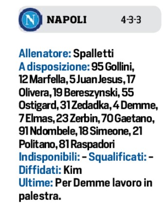 Domenica sera al “Maradona”, fischio d’inizio ore 20,45, si giocherà il testa-coda Napoli-Cremonese valevole per la ventiduesima giornata di campionato. Per Spalletti quasi tutti presenti, ad eccezione di Demme che ieri si è allenato in palestra. Per la terza gara di fila ci sarà la stessa formazione con Lozano in vantaggio rispetto a Politano. In casa grigiorossa mancheranno Lochosvili, Quagliata ed Okereke. In dubbio Dessers che oggi si valuterà l’infortunio e Benassi. In attacco probabilmente spazio a Ciofani, mentre il modulo di Ballardini sarà 3-5-2 con l’ex Chiriches a marcare Osimhen.