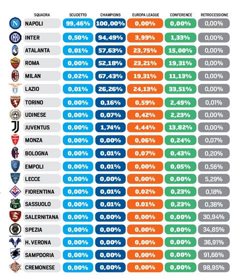 CINQUE SU MILLE. E allora, la corsa-scudetto firmata Opta. Un plebiscito ricavato attraverso uno studio che ha tenuto conto di tutti gli elementi utili all’analisi della vita di una squadra: recente passato, presente e futuro prossimo. I dati sono schiaccianti. Basta leggere i primi due: il Napoli vincerà lo scudetto al 99,46% mentre l’Inter, seconda in classifica con un distacco di 15 punti, lo vincerà allo 0,50%. Ovvero: per il Cervellone ha 5 possibilità su mille di compiere quella che passerebbe alla storia del calcio come un’impresa titanica. Da film. E ancora: da studio, il Milan ha lo 0,02% di chance-scudetto a disposizione, mentre Atalanta e Lazio lo 0,01%. Dalla Roma in poi: zero per cento.