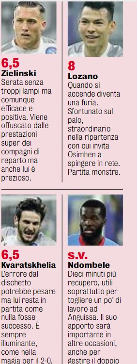 La Gazzetta dello Sport dà i voti al Napoli: migliori in campo Osimhen e Lozano, che prendono un 8 pieno come Spalletti; partita eclatante anche per Anguissa e Lobotka. Positiva la prova di Kvara nonostante l’errore dal dischetto, riscattato dall’assist di tacco per il gol di Di Lorenzo.