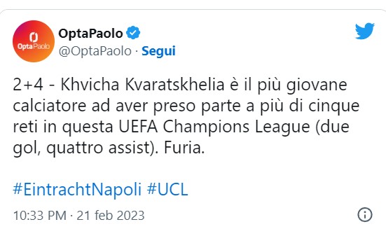 Nonostante una serata in chiaroscuro e un rigore fallito, Khvicha Kvaratskhelia riesce comunque a prendersi l’ennesimo record della sua stagione. Stavolta in Europa: come riportato da Opta Italia, infatti, il fantasista georgiano del Napoli è il più giovane calciatore ad aver preso parte a più di cinque reti in questa edizione della Champions League. In totale, due gol, quattro assist per lui.