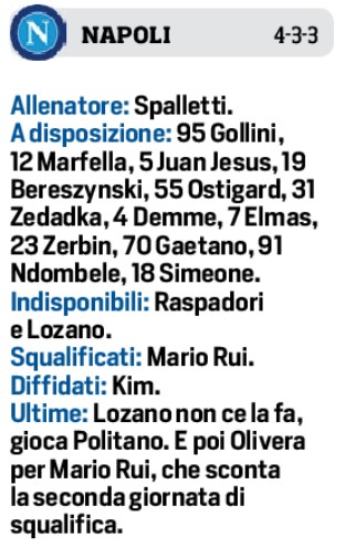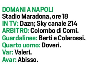 Domani pomeriggio allo stadio “Maradona”, fischio d’inizio ore 18,00, si giocherà il match Napoli-Atalanta. Per mister Spalletti due assenze, Lozano che si è allenato ieri in palestra e Raspadori. Quest’ultimo si tenterà di recuperarlo per il Torino. Unico ballottaggio Elmas-Zielinski a centrocampo. Per gli orobici ci sono i recuperi di Scalvini, Palomino e Zappacosta. Out invece Hateboer e Koopmeiners. In attacco favorito Boga rispetto a Pasalici, dietro a Lookman e Hojlund.