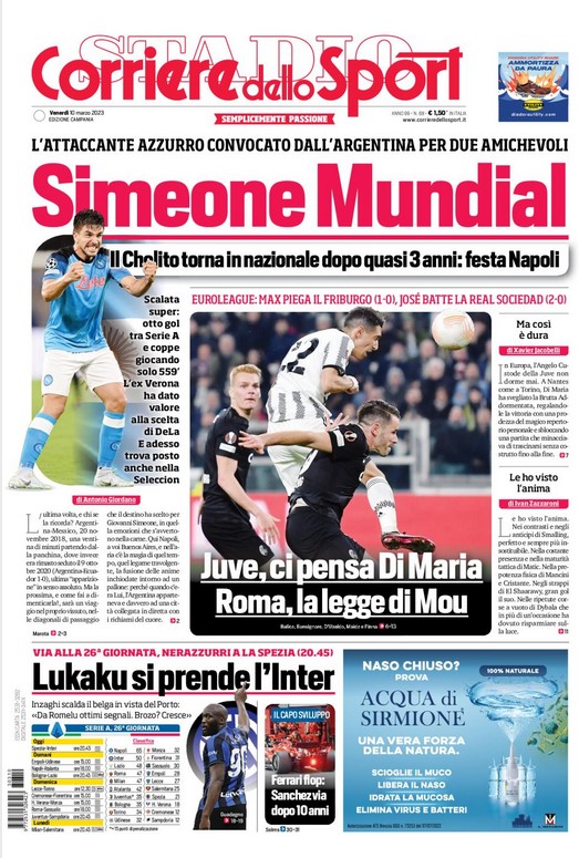 “PRIME PAGINE SPORTIVE”. Rassegna stampa del 10 marzo