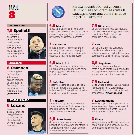 Haaland chiama e Osimhen risponde. E che meraviglia di risposta. Di quelle che entrano nella storia: due gol e il Napoli è nei quarti di Champions per la prima volta. Non c’era riuscito neanche con Maradona. Due gol, non cinque, ma il biondo norvegese è un alieno: Osimhen, però, è il primo dei terrestri, è Flash Gordon che si oppone all’invasione dallo spazio. Osimhen, Kvara, Lobotka, Di Lorenzo e tutti gli altri. Non c’è un peggiore, nessuno gioca a questi livelli con questa continuità. Il Napoli fa paura all’Europa, nessuno sa come prenderlo. Forse soltanto il Benfica, l’altra grande sorpresa, è nella stessa situazione. Tutti conoscono la solidità tedesca del Bayern, la manovra ultra-tecnica del City, la superiorità gestionale del Real Madrid. Ma quello di Spalletti è un gioco indecifrabile, velocissimo, creativo, spettacolare, a più voci, collettivo e individuale. Anche l’Eintracht è travolto in 180 minuti nei quali mai la qualificazione è stata in pericolo. Mai. Fonte e grafico Gazzetta