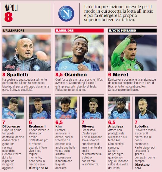II linguaggio del corpo dà la dimensione di un leader e non solo. Riguardate il fischio d’inizio: Victor Osimhen parte a razzo verso la porta avversaria come un velocista, prima che il pallone venga toccato dai compagni a centrocampo. L’arbitro è costretto a chiamare la falsa partenza. Ma quel gesto incute carica nei propri compagni e timore agli avversari. Oppure prendete i colpi di tacco di Khvicha Kvaratskhelia. Non una ostentazione di superiorità ma gesti giusti al momento opportuno. Perché se in una partita da fisici bestiali Osimhen si esalta, Kvara potrebbe soffrire ma alla fine mostra di avere più gamba di tutti. Lo capisci al tramonto di una gara favolosa, quando sul 4-0 si attendono gli ultimi giri di lancetta: il georgiano scatta una volta in più trasversalmente, da sinistra a destra e ancora di tacco smarca Elmas al tiro in area.