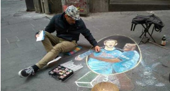 Dopo torte, babà, pizze, zeppole, sagome e bandiere, l’ennesimo tributo al Napoli dei record arriva anche dai madonnari. Messi da parte, almeno per un po’, santi e vergini, gli artisti di strada, i “pittori da marciapiede” celebrano i campioni azzurri.