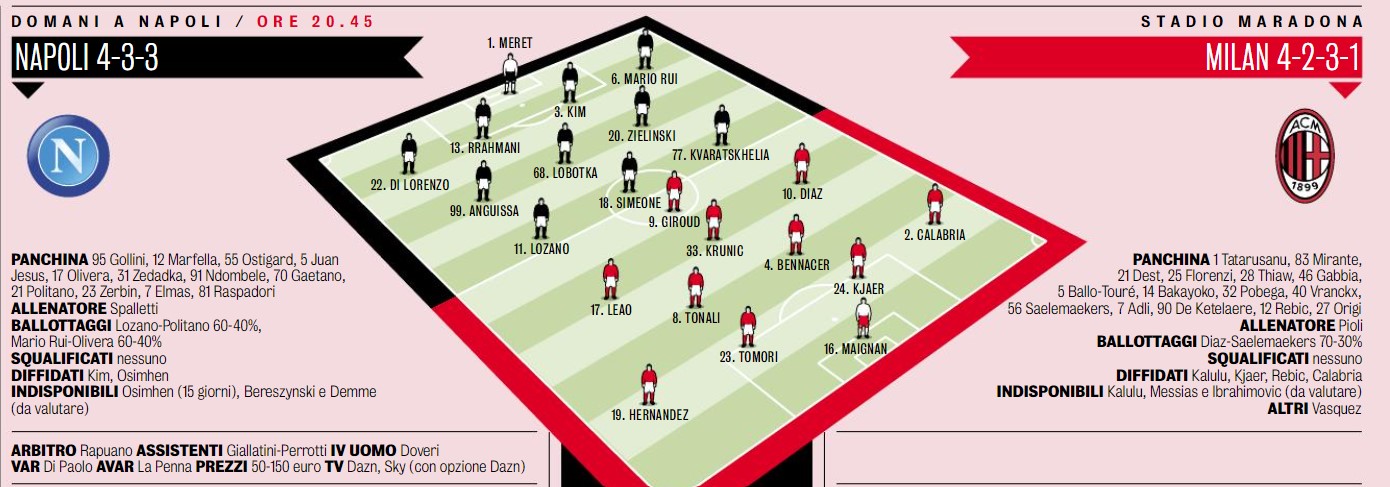 Quello che ormai è certo è che nel Napoli mancherà Victor Osimhen, di conseguenza nel big match di domenica sera non si vedrà in campo il capocannoniere del torneo di Serie A. In casa rossonera, invece, sicuramente non sdarà della partita Kalulu e in molti sostengono che Pioli dovrebbe passare alla difesa a 4. Staremo a vedere, intanto la Gazzetta dello Sport schiera così le due formazioni: