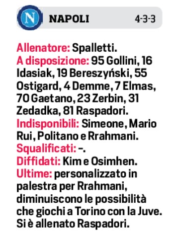 In realtà, la traccia di squadra c’è, sta lì, è la fotografia di questi mesi pieni di Napoli, di calcio verticale, di codice-Spalletti; e si riparte dai sette-undicesimi che hanno rappresentato la sintesi d’un pensiero fatto e finito: restano fuori, sicuramente, Politano e Mario Rui; probabilmente, ma si vedrà stamani, anche Rrahmani; e, stavolta senza che intervenga il medico, può darsi che riposi un centrocampista, magari Zielinski, o anche no. Da casa, si faranno compagnia con il «Cholito» Simeone, un altro al quale la sorte ha rifilato un tackle nei muscoli, e poi avanti tutti, poggiandosi su Osimhen che giocando e allenandosi sta sempre meglio, che ha dovuto rinunciare all’andata dei quarti con il Milan e al ritorno si è presentato generosamente senza essere ancora lui al 100%, ma che non vuole sentir ragioni, non può mancare, perché per vincere le partite bisogna segnare e lui, che ne ha fatti ventisei, insegue quota trenta a cui poi aggiungere la lode.
