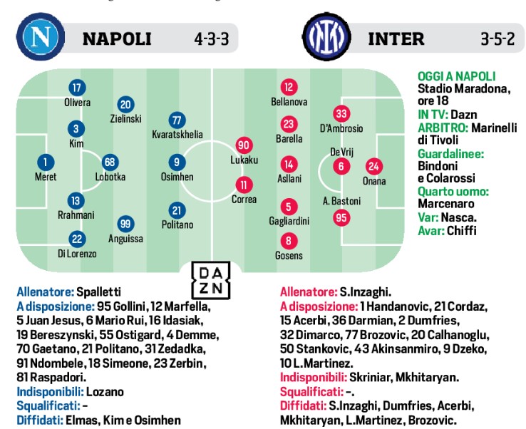 (Formazioni) Napoli/Inter – Il top per gli azzurri, rotazioni per Inzaghi