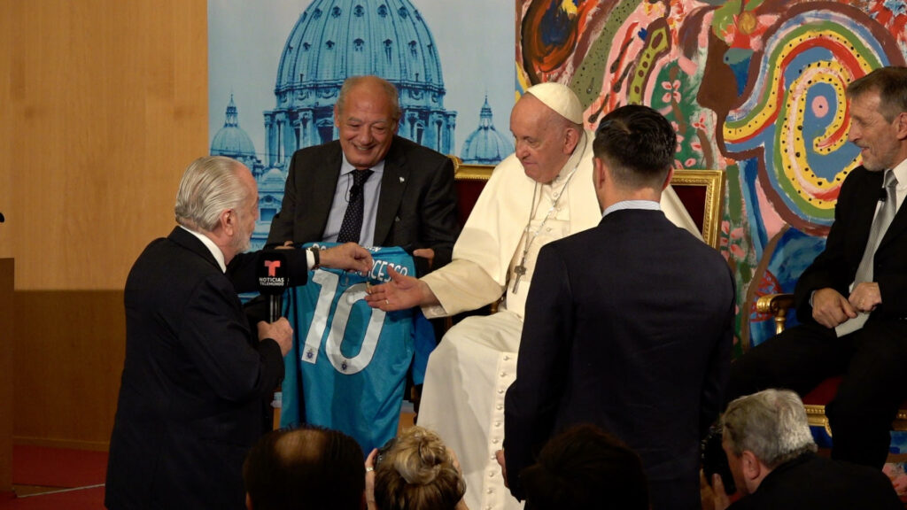 “Importantissimo, questa è la seconda volta che lo incontriamo, un’altra volta per una finale di Coppa Italia. Gli ho portato un simbolo, che è il piede di Maradona, da portare al collo per scacciare tutte le inopportunità che il mondo ci riserva, perchè con il pallone si riesce ad arrivare ovunque. Dall’altro lato gli ho portato due maglie col suo nome sopra, allora sarebbe molto bello se una delle due lui la esponesse durante l’Angelus, anche se sappiamo che non si può fare, ma sappiamo che Papa Francesco ogni tanto dà uno strappo in avanti, ed è per questo che sta simpatico popolarmente a tutto il mondo. Potrebbe così raccogliere qualche milione di euro da devolvere ai disastrati dell’Emilia Romagna o a quelli della guerra in Ucraina. Altrimenti potrebbe firmarla e ci pensiamo noi a metterla all’asta se proprio non lo potesse fare . Io credo che Papa Francesco è veramente un esempio per tutti quanti, perchè dotato di un’energia laica che però lo ravvicina a Dio sempre più di ogni altra cosa. Mi piacerebbe tanto organizzare, lui che ha detto che è tifoso di una squadra argentina, lo so perfettamente, dicevo mi piacerebbe proprio che lui potesse dare il calcio d’inizio in una partita fra il Napoli e questa squadra argentina per la quale lui tifa, rigorosamente allo stadio Maradona”.