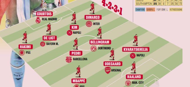 A centrocampo è impossibile lasciare fuori Jude Bellingham, del Borussia Dortmund, un habitué della nostra squadra della settimana, e Pedri, pupillo di Xavi e fresco vincitore della Liga col Barça. Il centravanti non può che essere quello che ha segnato nettamente più di tutti in questa stagione: Erling Haaland del City. A rifornirlo di assist un terzetto tutto talento, composto da Ødegaard, che ha fatto sognare tutti i tifosi dell’Arsenal, Mbappé, non vi dobbiamo spiegare il motivo, e Khvicha Kvaratskhelia, il nuovo volto vincente della nostra Serie A. Fonte: Gazzetta