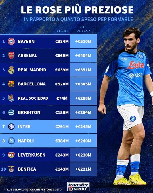 Tra le prime dieci europee, solo l’Inter in Italia ha fatto meglio (+245 milioni). Nello studio di Transfermarkt, gli azzurri sono al 8° posto della speciale classifica anticipando Leverkusen e Benfica, due club storici in tutta Europa per i gioielli scovati e gli affari di mercato. fonte: Il Mattino