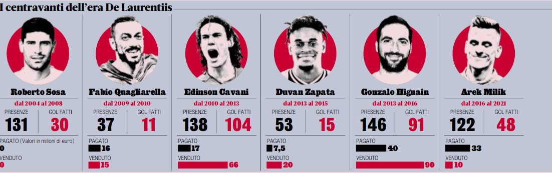 Pipita o pepita Tre stagioni da grande cannoniere per il Pipita prima di cambiare la prima vocale e tramutarsi in vera pepita d’oro per le casse del Napoli, perché c’è una clausola di riscatto da 90 milioni. Sembra una cifra inarrivabile. E invece nel 2016 la Juventus si ingolosisce per andare a prendere il recordman di gol della A. Tifosi imbufaliti contro il “traditore” argentino e il presidente che va a prendere dall’Ajax Arek Milik investendo solo un terzo del ricavato dalla cessione. Il polacco si infortuna due volte gravemente, ma è qui che MagAurelio tira fuori il coniglio dal cilindro. Sì perché nell’era Higuain cresceva nell’ombra Duvan Zapata, altro signor centravanti, che non trovando spazio viene ceduto al triplo del suo costo. Il resto lo fa Maurizio Sarri che senza più Higuain e con Milik allettato s’inventa Dries Mertens centravanti e il belga diventa il più grande marcatore di tutti i tempi del Napoli.